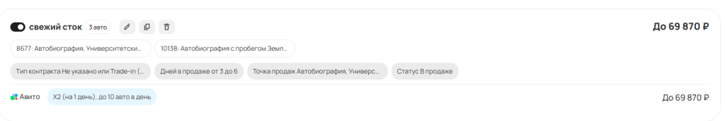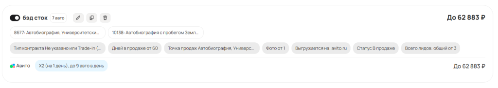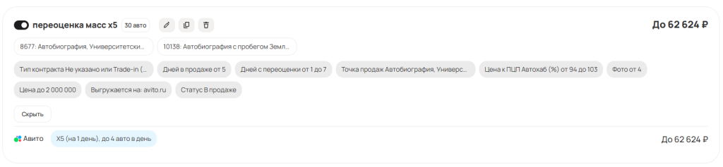 В итоге, если цена авто меняется на 1–2% вверх или вниз, но остаётся в рынке, к объявлениям в течение 10 минут применяется дополнительное продвижение. Дилер выбрал услугу «До 5 раз больше просмотров на 1 день» на Авито — это продвижение средней силы.