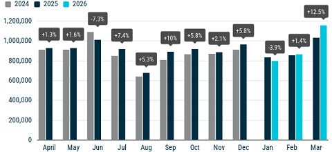 В марте рынок новых легковых автомобилей в ЕС увеличился на 12,5% к аналогичному месяцу прошлого года. Согласно данным ACEA, объем регистраций составил 1,16 миллиона машин. Результат I квартала 2026 года – 2,82 миллиона автомобилей (+4%).