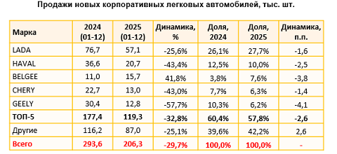 По итогам 2025 года корпоративным клиентам было продано 331,7 тысячи легковых автомобилей. Согласно данным НАПИ, 206,3 тысячи машин были новыми, 125,4 тысячи – подержанными. В первом случае спад составил 30%, во втором зафиксирован рост на 5%.