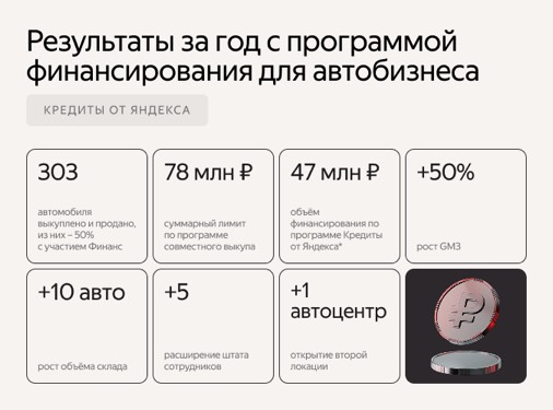 - объём финансирования по программе Кредиты от Яндекса* — 47 млн рублей;