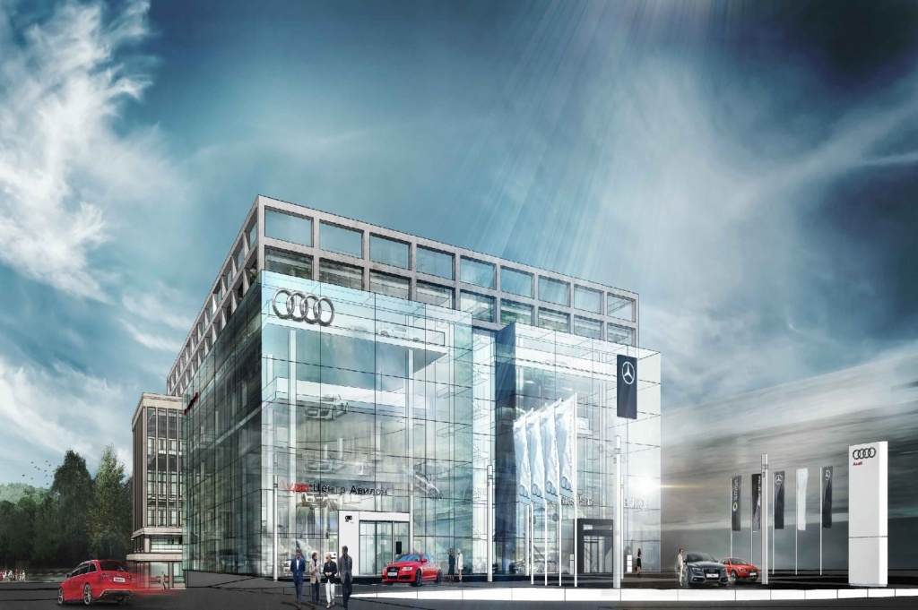 Дилерский центр ГК «Авилон» общей площадью 20 тысяч кв.м станет самым крупным для Audi и Mercedes-Benz в Европе. Для каждого бренда предусмотрен отдельный вход, попасть из одной части здания в другую можно будет только по улице. Подземный этаж предназначен для размещения сервисного центра, на пятом разместится стоянка.