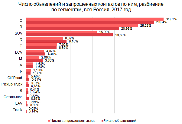 В России и по предложению, и по спросу традиционно лидирует АвтоВАЗ: в 2017 году в 23% всех опубликованных на «Авито Авто» объявлений предлагалось приобрести машины «Лада», на которые пришлось 32% запросов контактов. Их средняя стоимость – 158 тысяч рублей. Для сравнения: средняя цена Toyota составляет 823 тысячи рублей, Hyundai – 557 тысяч, Volkswagen – 584 тысячи, Ford – 446 тысяч.