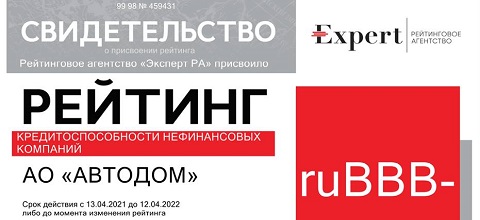 Агентство «Эксперт РА» присвоило рейтинг кредитоспособности ГК «Автодом» на уровне ruBBB-. Прогноз по рейтингу – стабильный.
