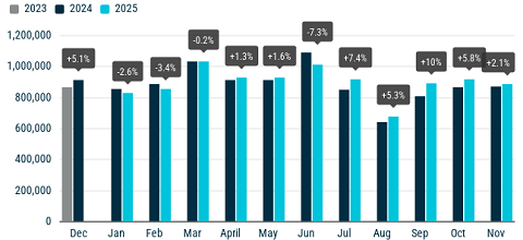 В ноябре рынок новых легковых автомобилей в ЕС увеличился на 2% к аналогичному месяцу прошлого года. Согласно данным ACEA, объем регистраций составил 887,5 тысячи машин. Результат 11 месяцев 2025 года – 9,86 миллиона автомобилей (+1%).