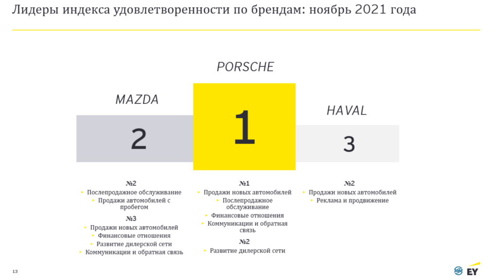 В тройку лидеров исследования DSI-2021 вошли Porsche, Mazda и Haval. Примечательно, что немецкий бренд впервые не только занял первое место, но и в целом попал в топ-3, победив сразу в нескольких номинациях (продажи новых автомобилей, послепродажное обслуживание, финансовые отношения» и коммуникация и обратная связь). Также в числе лучших дебютировал Haval. Лидер прошлого рейтинга – Mazda – в этом году взяла «серебро».