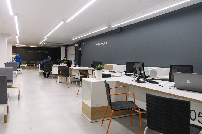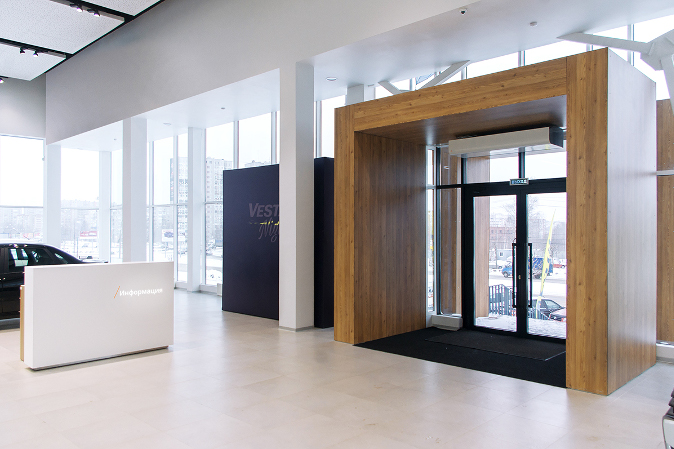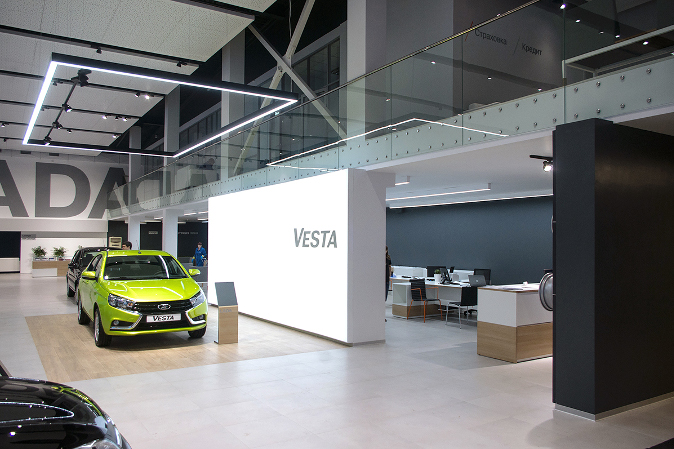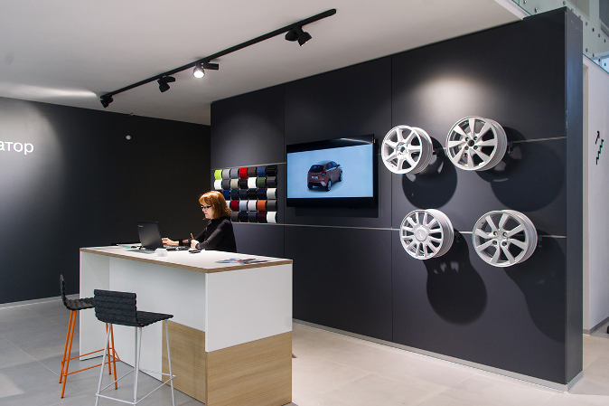 Основной акцент сделан на входную группу, которая решена в виде портала на фасаде здания. Напротив главного входа расположена зона, где демонстрируются новинки и топовые модели «Лада». В планировочном решении рабочих мест применен «островной» принцип, а в новом конфигураторе теперь можно выбрать цвет кузова и обивку салона автомобиля.