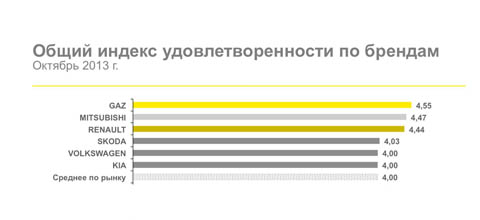 Впервые лидером рейтинга стала марка ГАЗ, набрав 4,55 балла. Отечественный производитель добился лучших показателей в четырех категориях – поддержка продаж новых автомобилей, послепродажное обслуживание, реклама и продвижение, а также коммуникации и поддержка обратной связи.