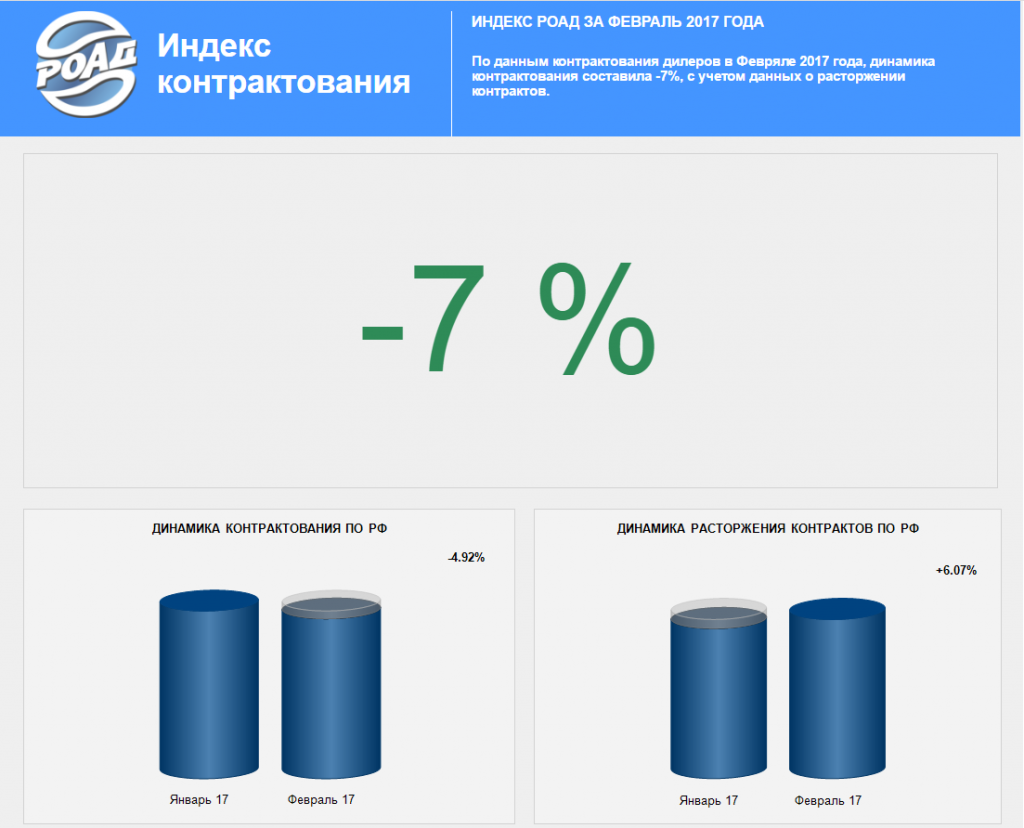По итогам февраля динамика контрактования дилеров составила -7%. Об этом свидетельствуют данные ассоциации «Российские автомобильные дилеры» (РОАД).