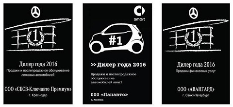 В частности, краснодарский холдинг «Ключавто» признан лучшим дилером по продажам и обслуживанию легковых автомобилей Mercedes-Benz. В свою очередь, московская компания «Панавто» выиграла в номинации «Лучший дилер по продажам и обслуживанию Smart». Наконец, автоцентр «Авангард» из Санкт-Петербурга стал лауреатом конкурса по направлению продаж финансовых услуг.