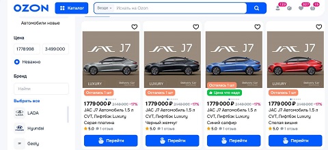 Автомобили на Ozon продаются только по предоплате. В начале 2025 года на площадке были представлены 1 180 карточек машин. Сейчас это количество увеличилось в пять раз – почти до 6 тысяч. Всего на площадке можно найти транспортные средства от 60 брендов.