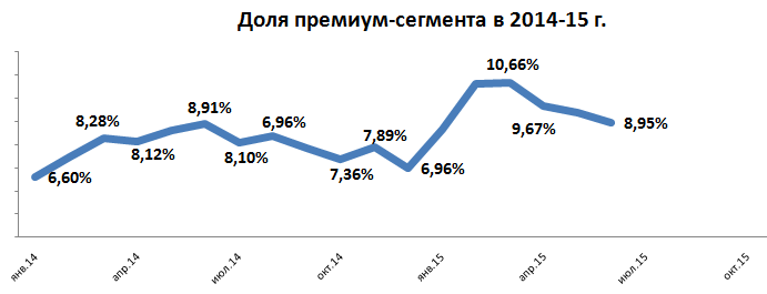Доля премиум-сегмента по итогам шести месяцев 2015 года составила 9,7%. Это на 1,7 п.п. выше, чем годом ранее. Однако начиная с апреля показатель демонстрирует тренд к снижению. Если в марте значение достигало 10,7%, то в июне доля опустилась до 8,95%.