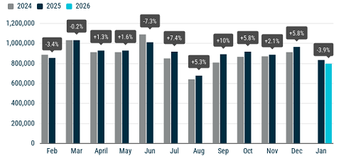 По итогам января рынок новых легковых автомобилей в ЕС сократился на 4% к аналогичному месяцу прошлого года. Согласно данным ACEA, объем регистраций составил 799,6 тысячи машин.