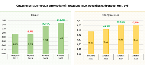 Средняя цена нового легкового автомобиля российского бренда в апреле составила 1,48 миллиона рублей. Это на 12% больше, чем в апреле прошлого года, и на 55% больше по сравнению с февралем 2022 года, свидетельствуют данные НАПИ.