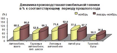 Производство легких коммерческих автомобилей в январе-ноябре снизилось на 36% – до 79,7 тысячи единиц. Рост показали «Автодом» (в 12 раз) и «Автотор» (+13%). Спад зафиксирован на заводах «Соллерс Карго» (-85%), «Нижегородец» (-62%), «Автомобильные индустриальные технологии» (-58%), «Соллерс Алабуга» (-52%), «ВИС-Авто» (-48,5%), ГАЗ (-39%), «Луидор» (-28%), «Тракс Восток Рус» (-15%) и УАЗ (-13%).