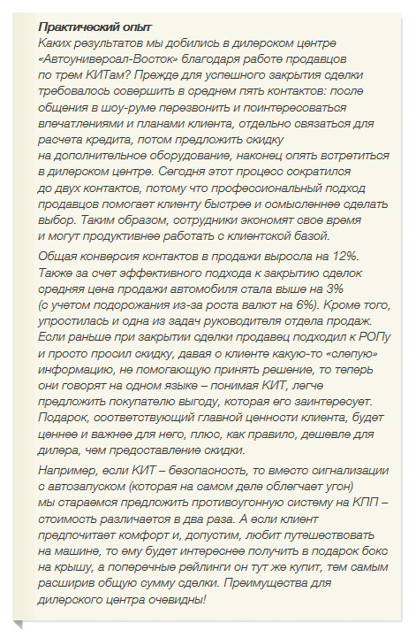 Описывая функциональность автомобиля исходя из выявленного КИТа, продавец получает у клиента подтверждение необходимости для него той или иной опции в конкретном ракурсе. После этого у потенциального покупателя просто нет шансов взять тайм-аут на размышление. Он убежден, что лучшего автомобиля под свои нужды ему не найти, а в сотруднике дилерского центра видит понимающего и внимательного эксперта и помощника.