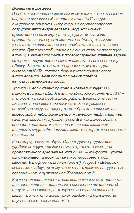 Другой сценарий: во время знакомства в шоу-руме клиент говорит о превосходном качестве и надежности прежнего автомобиля. Его КИТ – это комфорт! Расскажите о том, что рассматриваемая модель признана авторитетными исследовательскими центрами самой надежной в одной из номинаций, обратите внимание на посадку и эргономику, сделайте акцент на гарантии и круглосуточной техподдержке на дорогах, не забудьте про объем двигателя и мощный отклик на нажатие акселератора, который позволит всегда чувствовать себя уверенно, а значит комфортно – ведь именно это важно для покупателя.