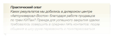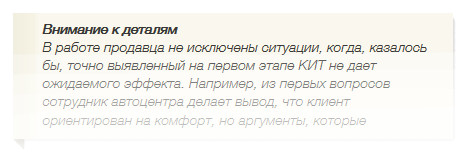Все мы знаем закон Парето, гласящий, что 20% усилий дают 80% результата, а остальные 80% усилий – лишь 20% результата. Именно поэтому в нашем случае потребитель должен получить 20% информации об автомобиле, но – обязательно! – в соответствии со своим КИТом.