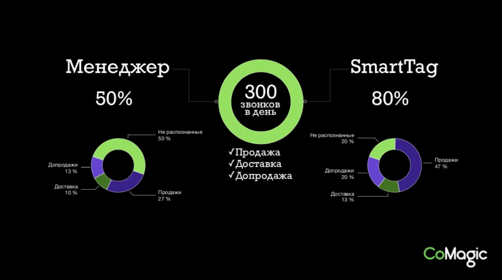 Система SmartTag была протестирована на некоторых клиентах CoMagic и показала впечатляющие результаты: во-первых, распознала на 30% больше обращений, во-вторых, оказалась в среднем в 2 раза дешевле, чем совместная работа менеджера и контроллера, который тегировал входящие звонки вручную.