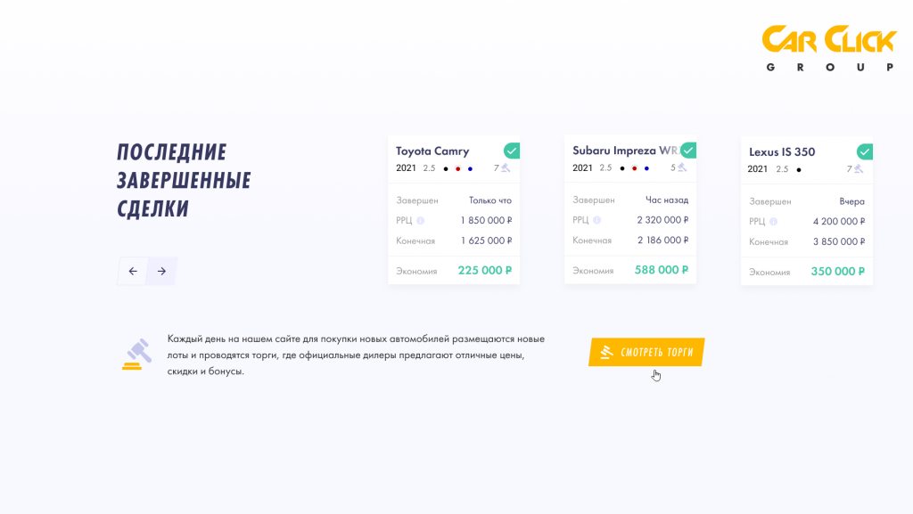 Поэтому была создана система, которая позволяет дилерам проводить торги по множеству лотов. Партнеры CarClick.Ru активно участвуют в них, снижая начальную стоимость автомобилей и предлагая клиентам бонусы. По большей части это стало возможным благодаря снижению затрат автосалонов на маркетинг, персонал, склады и кредиты.