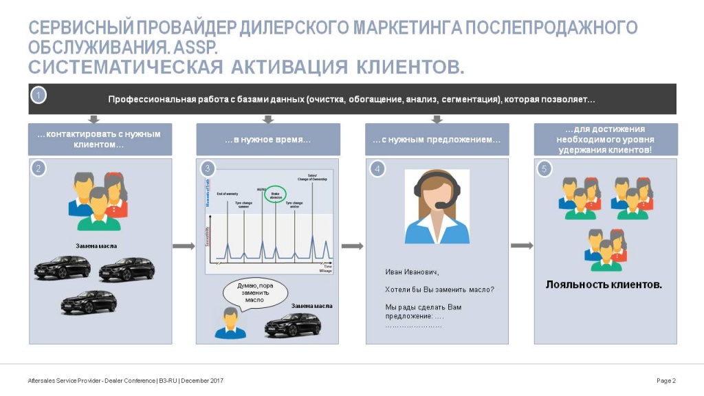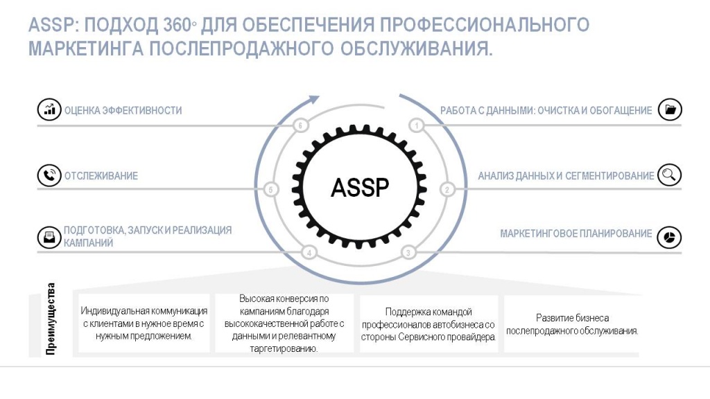 Глобально проект берет на аутсорсинг дилерский маркетинг в направлении послепродажного обслуживания, начиная от построения индивидуального маркетингового плана и аналитики деятельности дилерского предприятия и заканчивая реализацией и отслеживанием выполнения KPI сервисных кампаний.