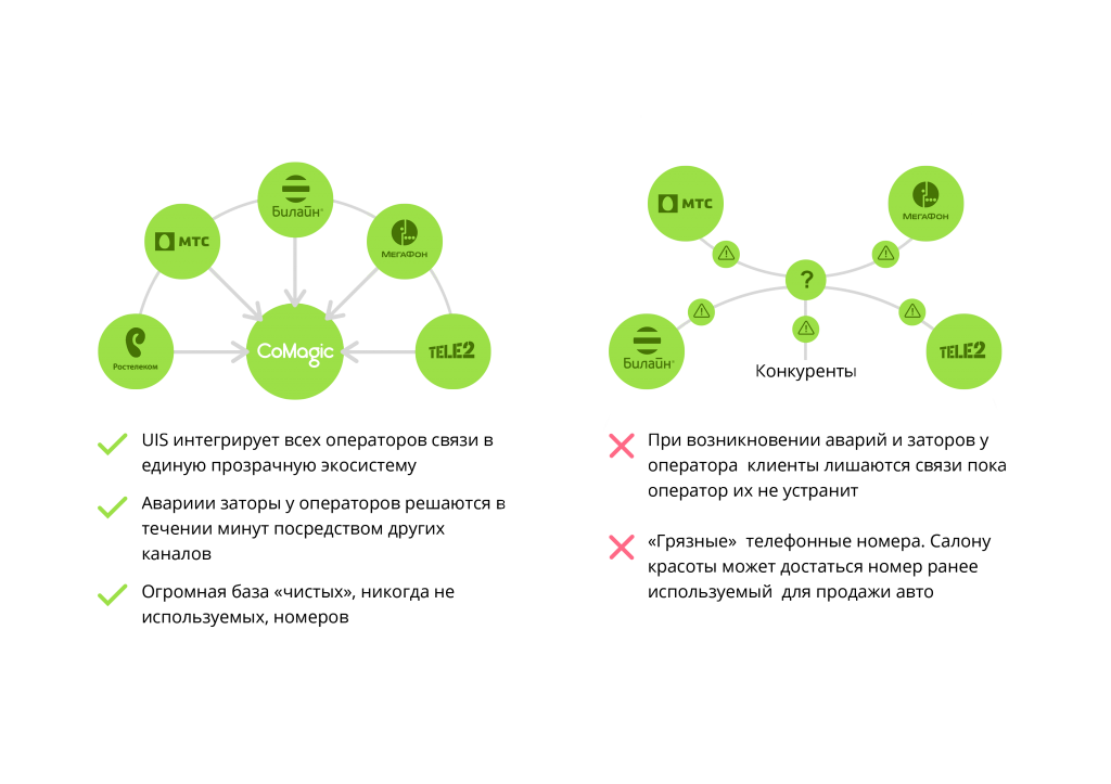 - На надежность и достоверность предоставляемых данных: «Наши клиенты теряют на 15-20% меньше звонков, только потому что наш сервис построен на базе собственного крупного оператора связи. Мы работаем без посредников с большой тройкой операторов (МТС, Билайн, Мегафон), а с 2016 года с Ростелеком, что обеспечивает прозрачный контроль в режиме реального времени за любыми неполадкам в сети и возможность мгновенного перенаправление звонков наших клиентов на резервные телефонные каналы в случае возникновения любой внештатной ситуациия». – Кудинов Дмитрий, СЕО CoMagic